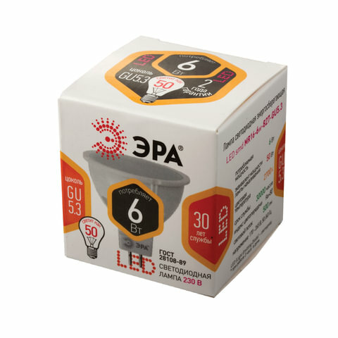 Лампа светодиодная Эра 6, 50 Вт, цоколь GU5.3, MR16, теплый белый свет, 30000 ч (6w-827-GU5.3)
