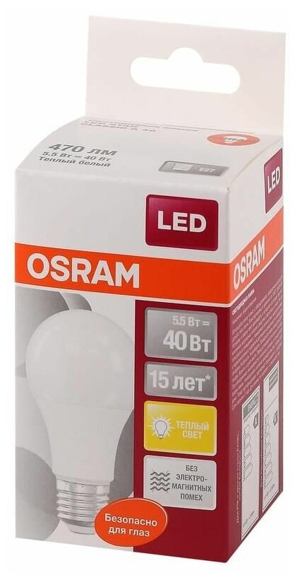 Отзывы на Светодиодная лампа OSRAM LED STAR, A, стандарт, 5.5Вт, E27, 470 Лм, 2700 К, теплый белый свет 4052899971516
