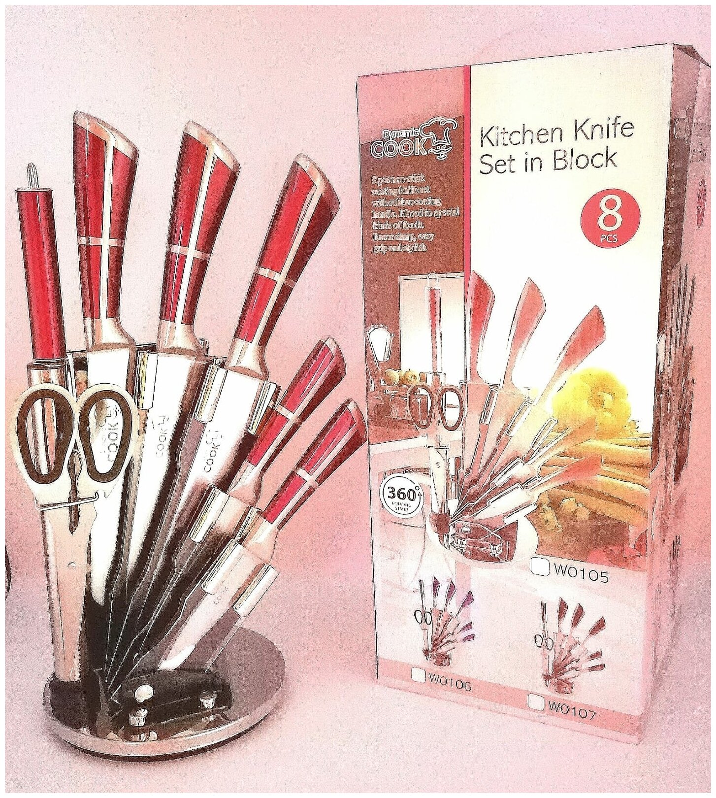 | Комплектация | Нож: топорик- 1, для хлеба- 1, поварской- 1, универсальный- 1, для чистки- 1, ножницы-1, ножеточка- 1, подставка- 1. |