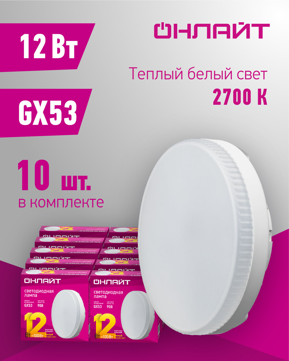 Лампа светодиодная онлайт 61 190, 12 Вт таблетка, GX53, теплый свет 2700К, упаковка 10 шт. 800 ₽