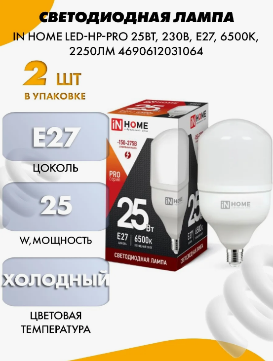 Лампа светодиодная LED-HP-PRO 25Вт 230В 6500К E27 2250лм IN HOME 4690612031064 (2шт.в упак.)
