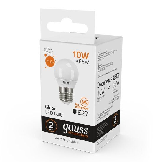 Лампа светодиодная Elementary 10Вт P45 шар 3000К тепл. бел. E27 710лм GAUSS 53210