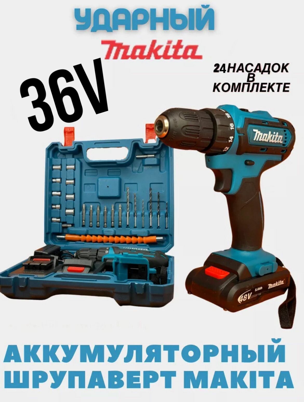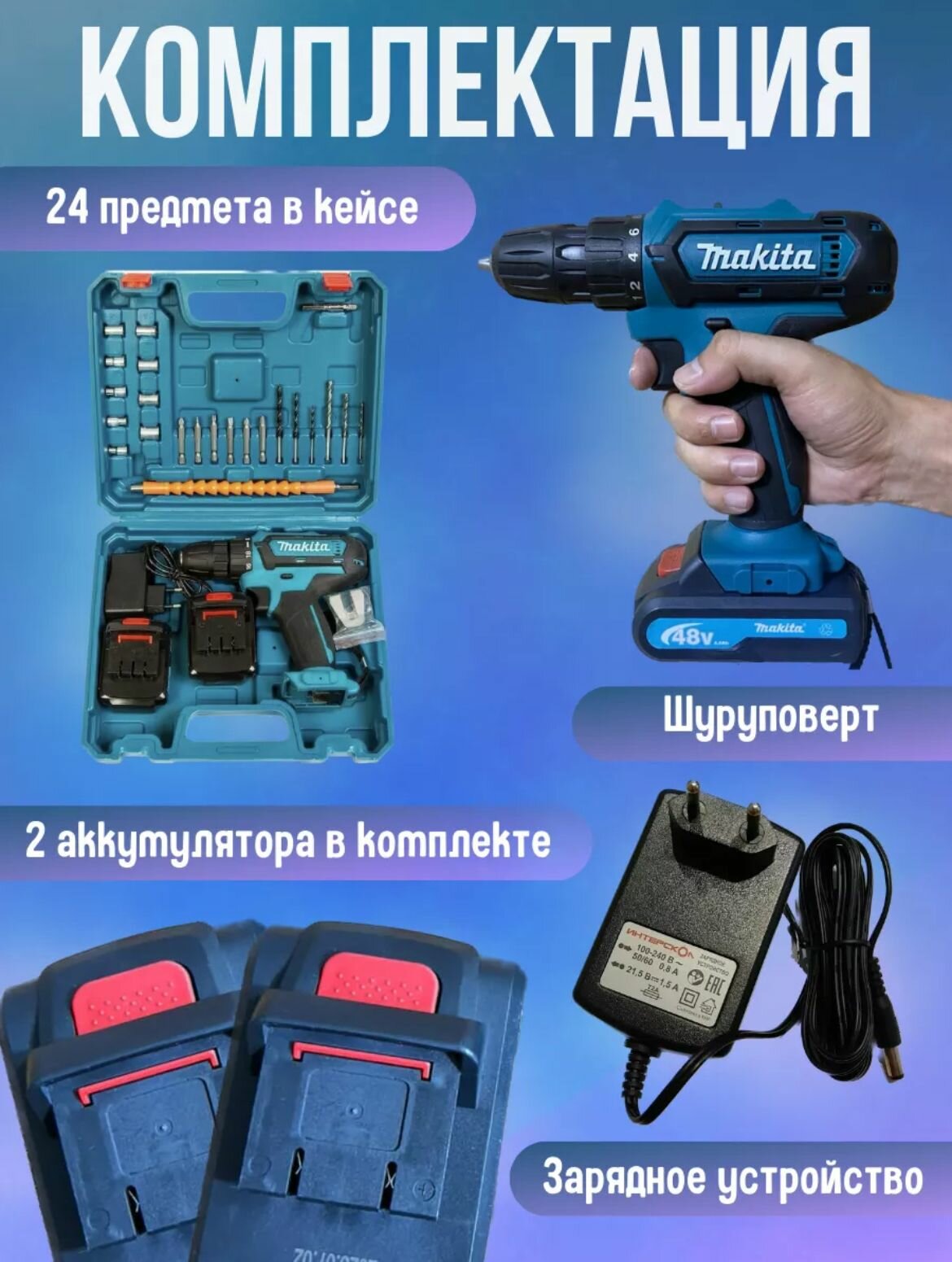 Шуруповерт с 2 аккумуляторами и комплектом инструментов в кейсе/биты + сверла в комплекте