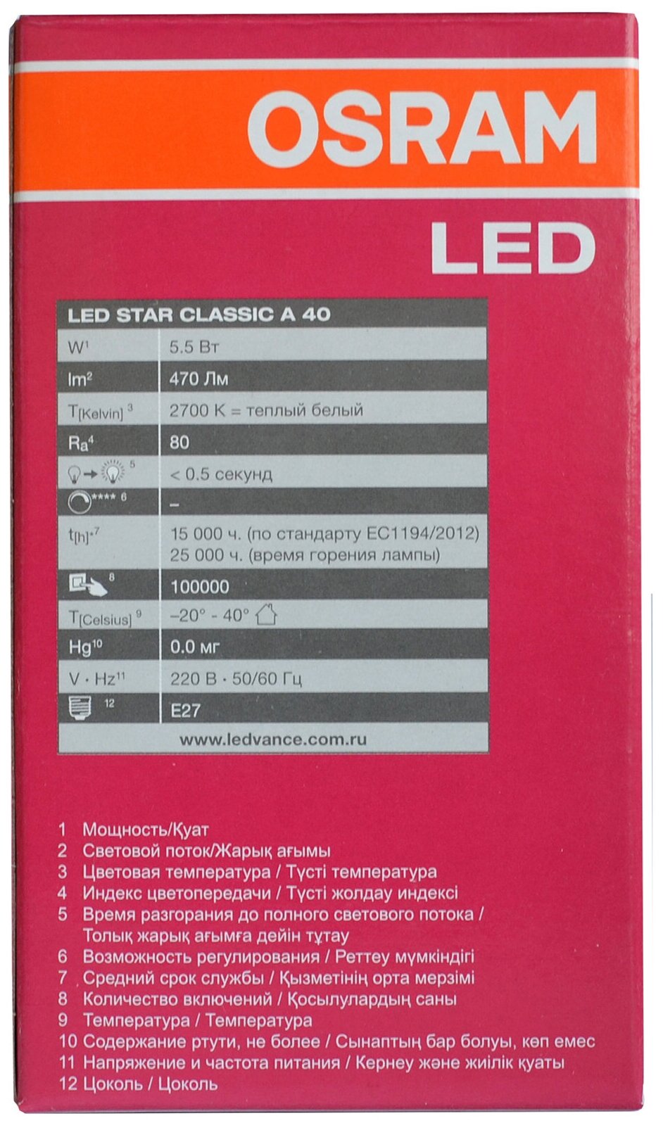 Лампочка светодиодная OSRAM Груша A E27 5,5Вт 220В 470Лм 2700К Теплый белый, упаковка 10шт информация: