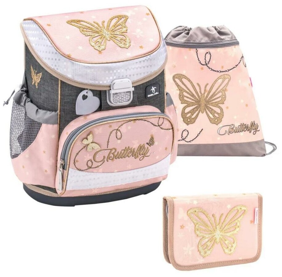 Ранец школьный каркасный, с ортопедической спинкой BELMIL Mini-Fit BUTTERFLY с наполнением, эрго-спинка, пенал c 2 планками, мешок для обуви информация: