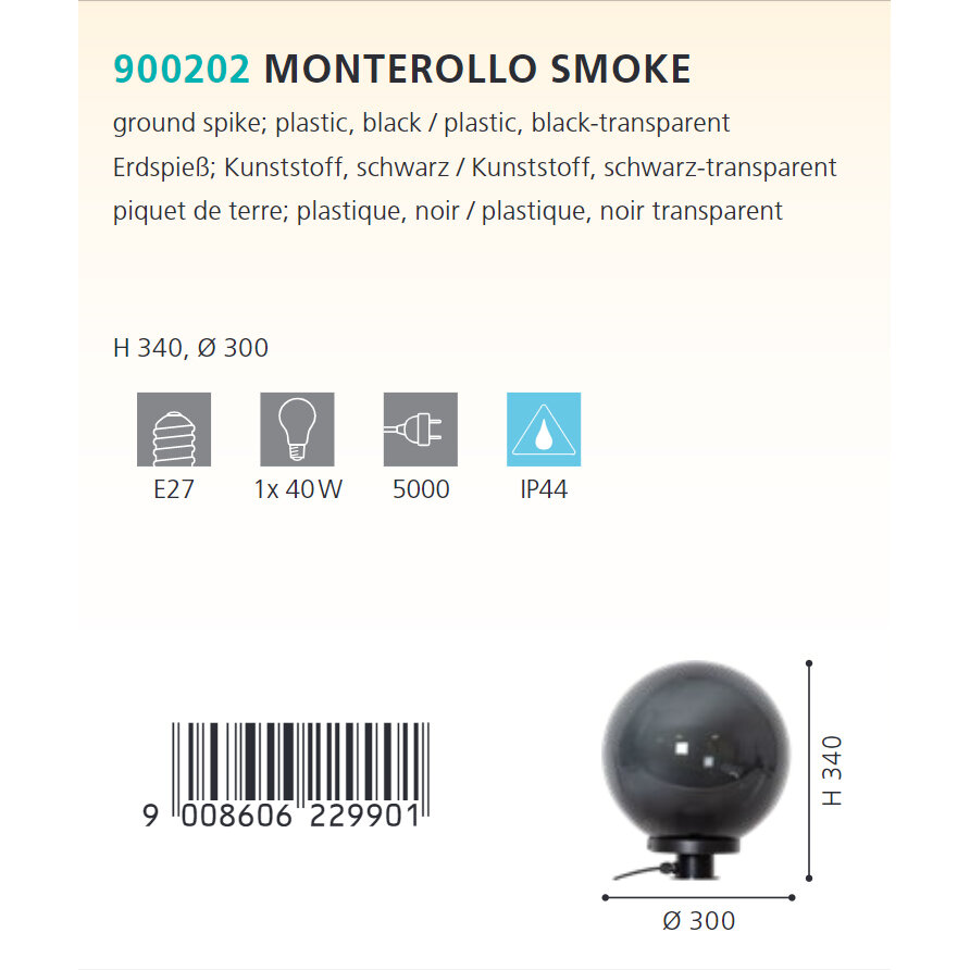 900202 Ландшафтный светильник MONTEROLLO SMOKE, E27, 1X40W, IP44, H340, Ø300, пластик, черный/пластик, черный полупрозрачный 11 790 ₽