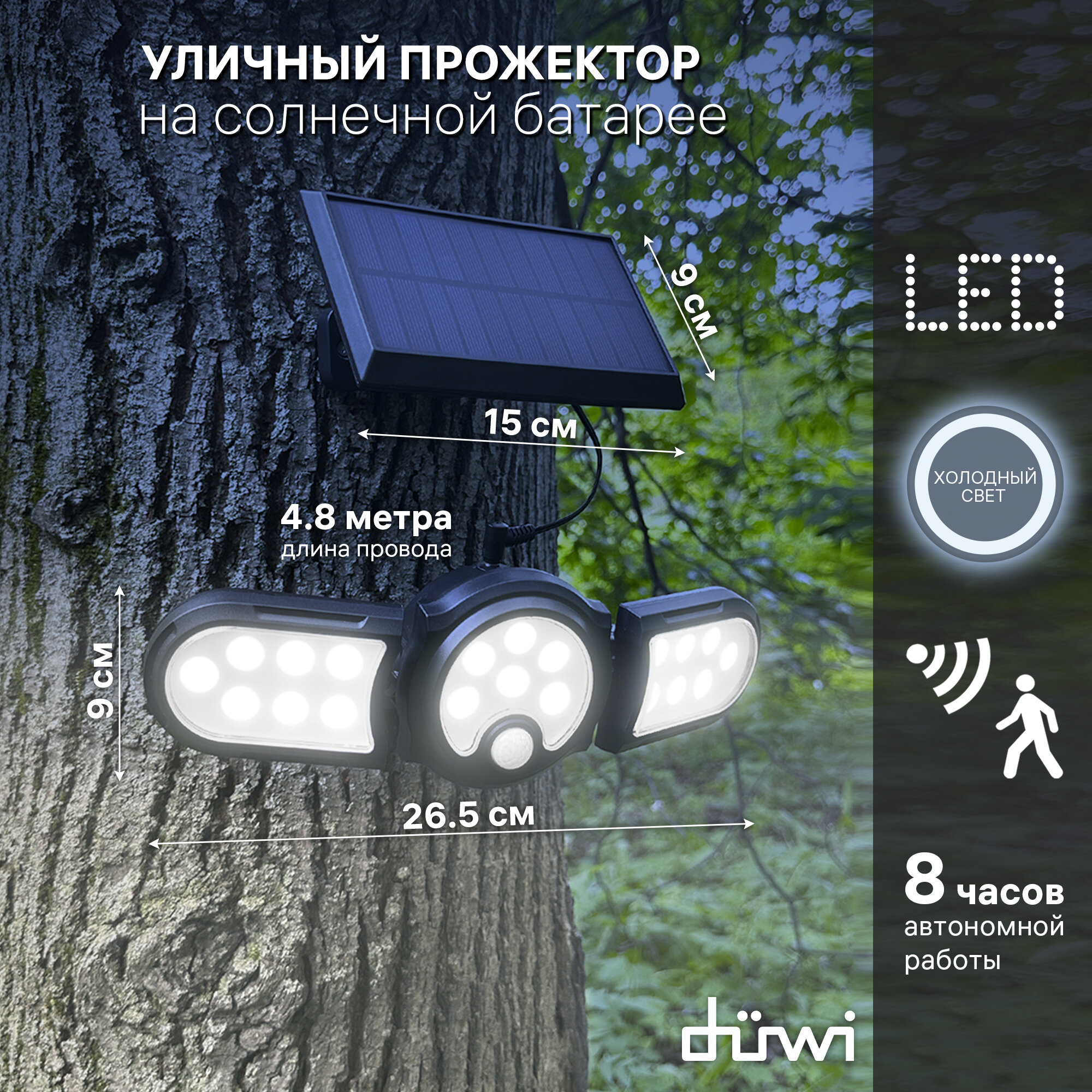 Светильник светодиодный с датчиком движения Solar LED на солнечных батареях, 28Вт, 6500К, 910Лм, IP65, 3 режима, цвет черный, duwi, 25019 7 информация: