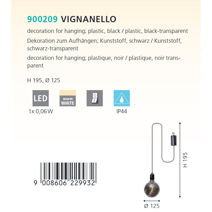 900209 Уличный потолочный светильник VIGNANELLO, LED 1X0,06W, IP44, H195, 125, пластик, черный/пластик, черный полупрозрачный 1 990 ₽