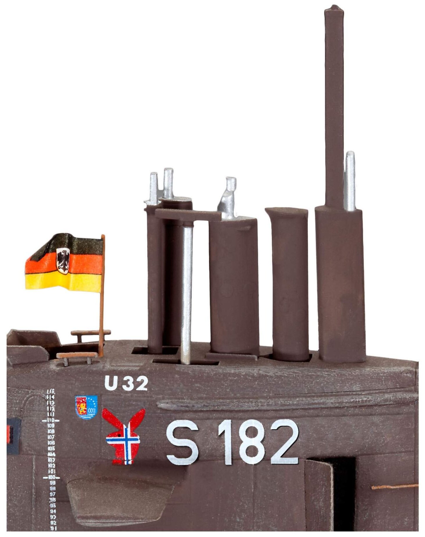 | Дополнительная информация | модель может быть построена как погруженная или всплывающая версия; детализированный корпус, пропеллер, перископ, антенная мачта, вытяжная мачта; 4 отдельных руля на корме; подставка для модели в комплекте |