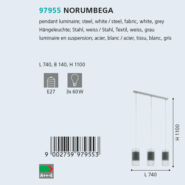 97955 Подвес NORUMBEGA, 3х60W (E27), L740, B140, H1100, сталь, белый / cталь, текстиль, белый, серый