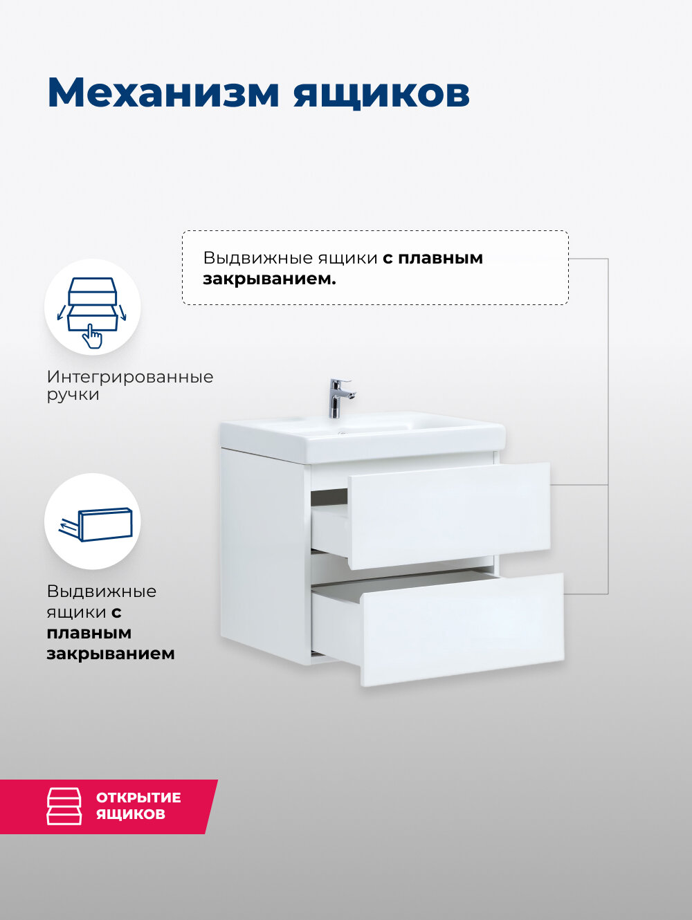 | Комплектация | тумба под раковину (раковина приобретается отдельно), 2 выдвижных ящика |