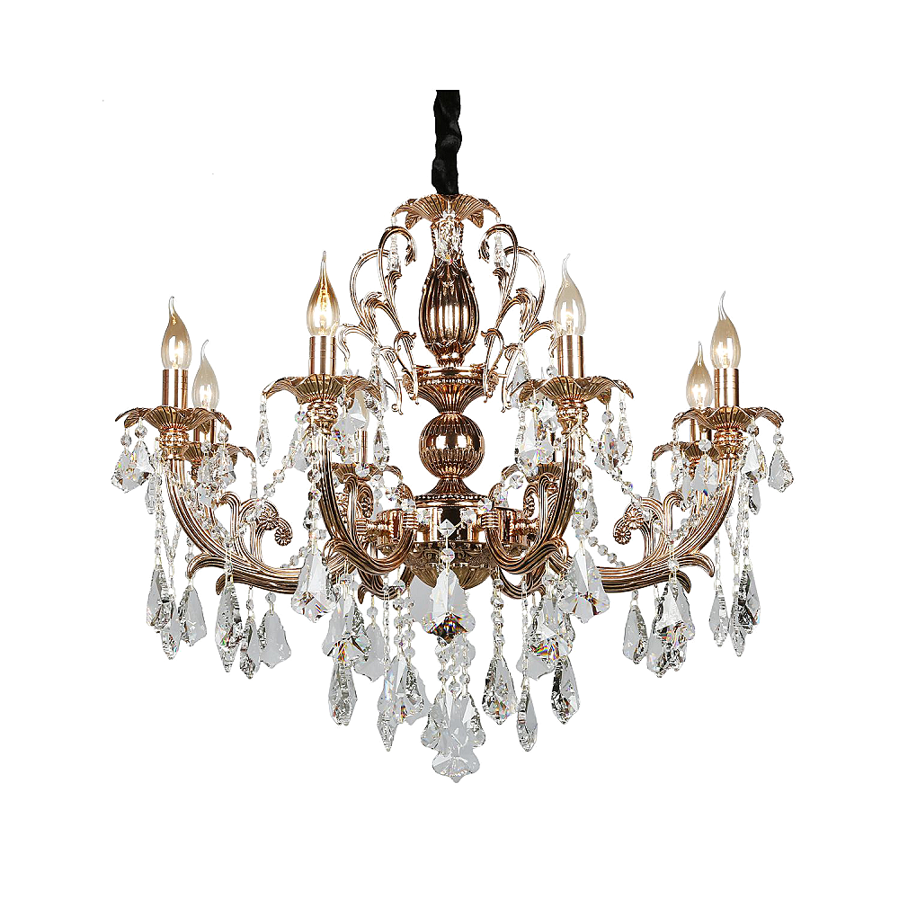 Люстра хрустальная золотая подвесная круглая с прозрачными хрустальными подвесками на 8 ламп E27, регулировка по высоте