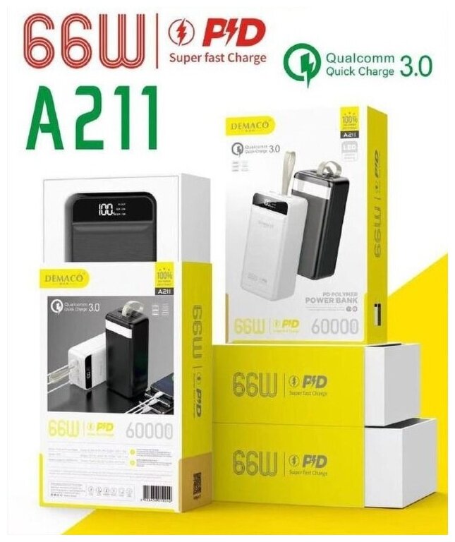 10 цен на Внешний аккумулятор повербанк Demaco A211 QC3.0 PD18W на 60000 mAh. Черный