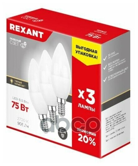 Светодиодная лампа Rexant Свеча E14, 9.5 Вт, 903 Лм (=75 Вт), 2700 K (теплый свет), упаковка 3 шт.