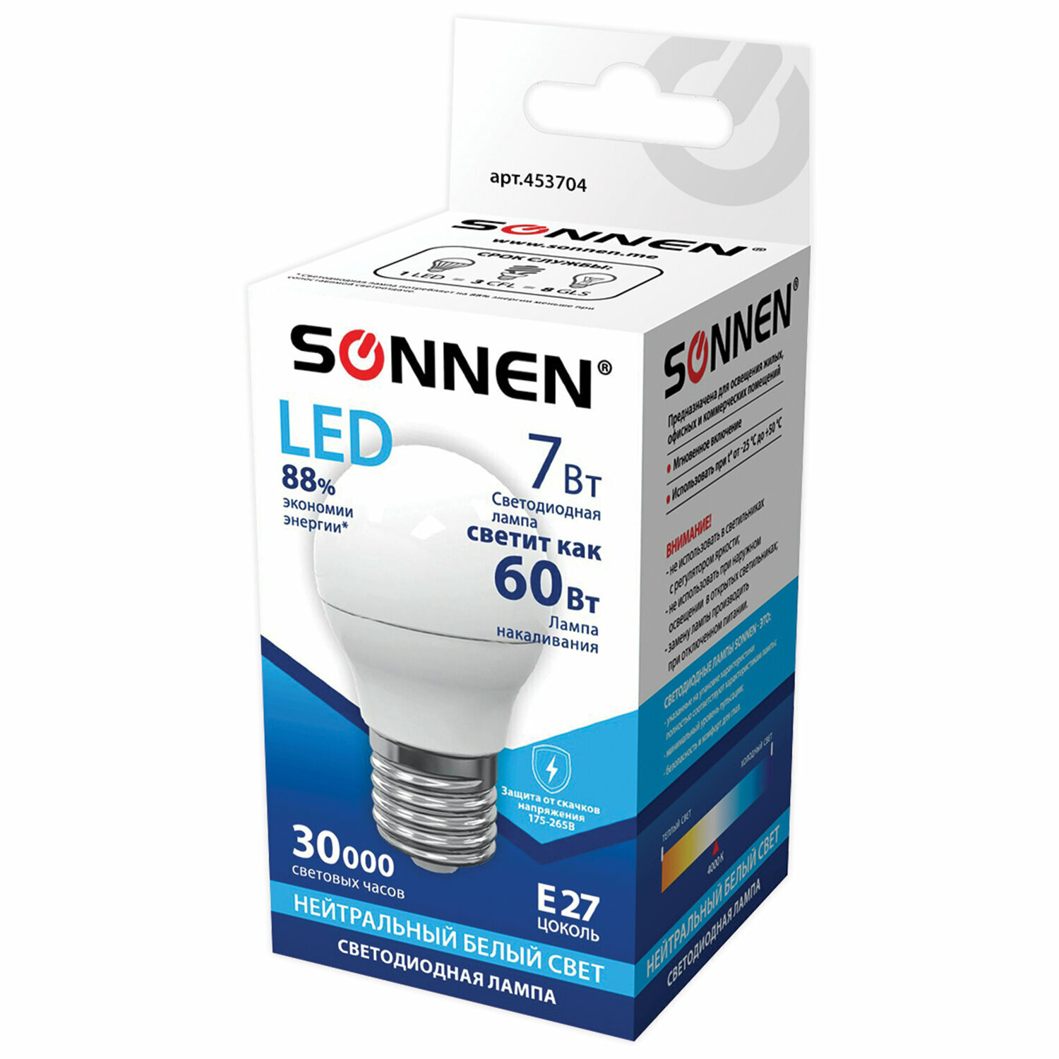 Лампа светодиодная SONNEN, 7 (60) Вт, цоколь E27, шар, нейтральный белый свет, 30000 ч, LED G45-7W-4000-E27, 453704, 453704 342 ₽