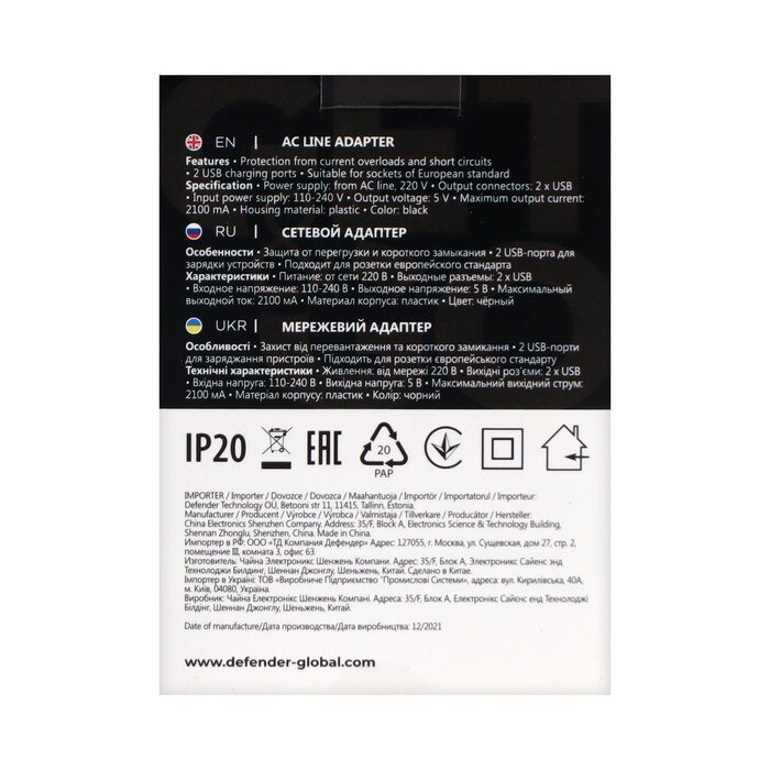 Сетевое зарядное устройство Defender UPA-22, 2 USB, 2.1 А, черное информация: