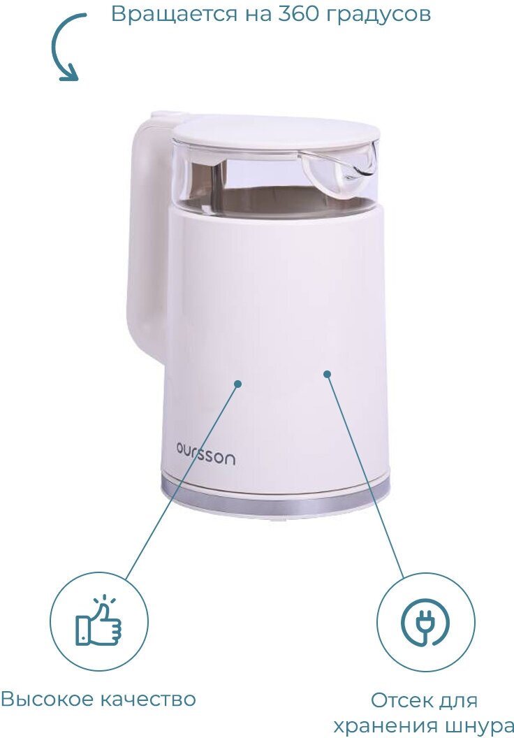 Электрический чайник Oursson KE1732W/IV, 2200 Вт, 1.7л, пластик/стекло, белый 2 190 ₽