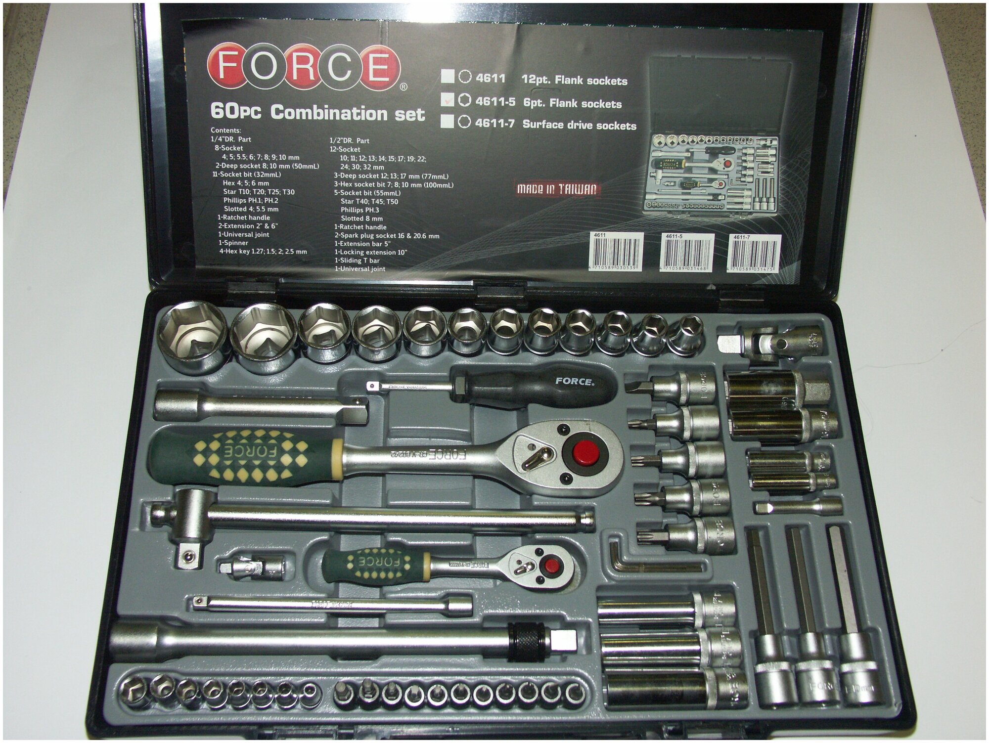 1/4"+1/2" Наборр Инструмента 60 пр., 6-гр. (4-32мм) FORCE 4611-5 информация: