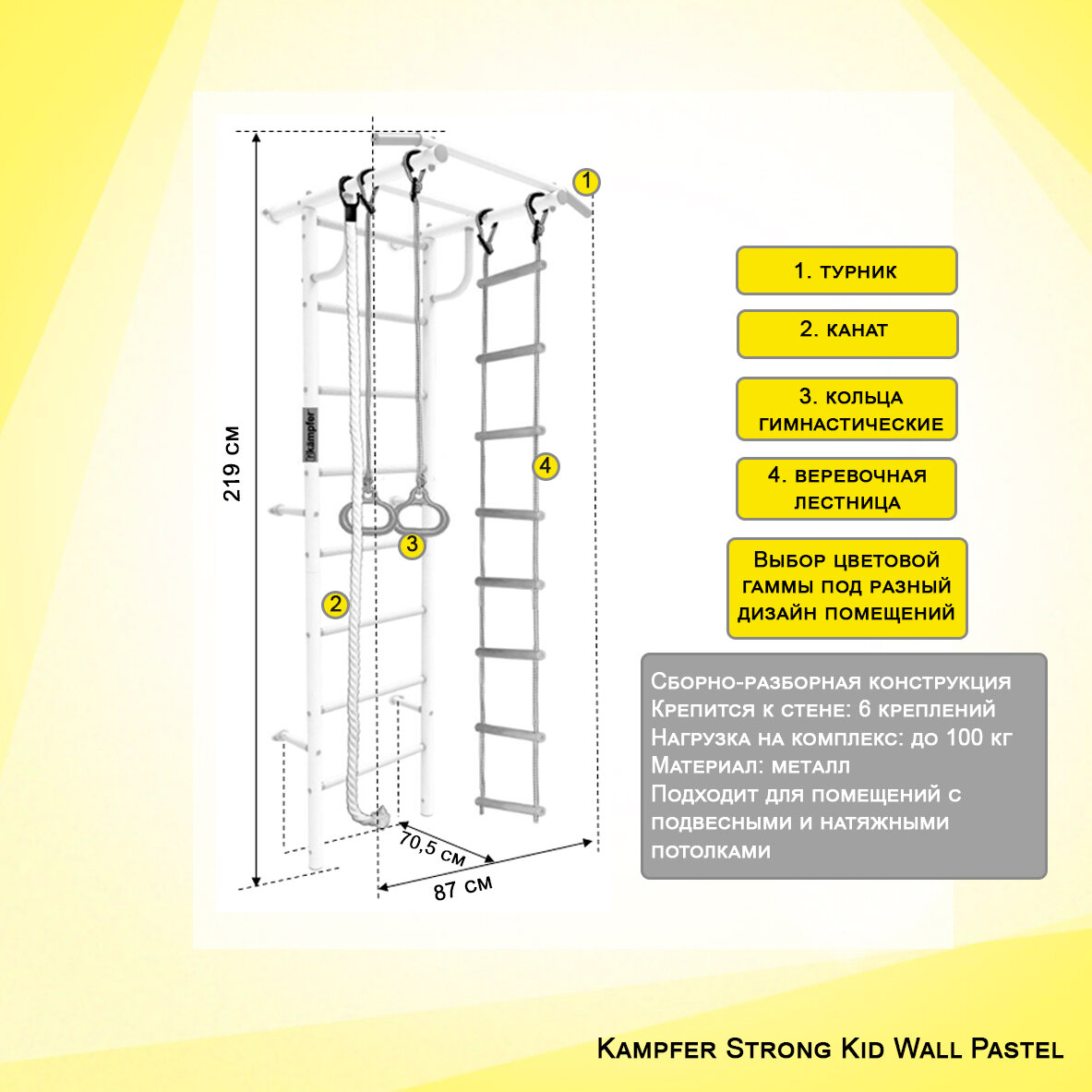 | Комплектация | Шведская стенка, турник, веревочная лестница, кольца гимнастические, канат |