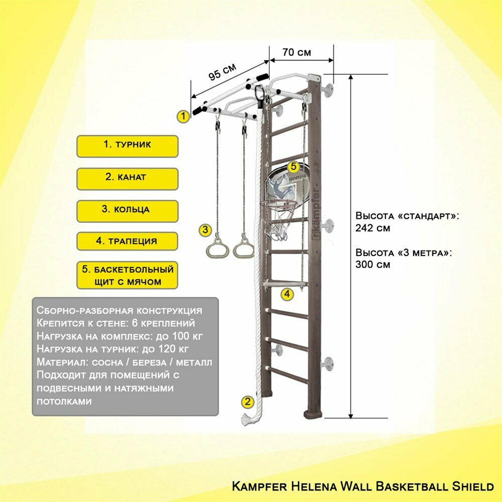 Kampfer "Helena Wall Basketball Shield" спортивно-игровой комплекс 2,4 м. (стандарт) Натуральный/Белый турник информация:
