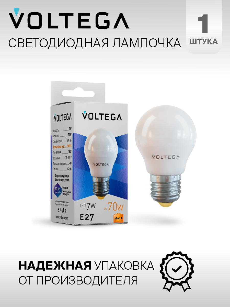 Лампочка светодиодная E27 форма шар матовый 7W теплый свет Voltega Simple Globe 2800K упаковка 10 штук 1 485 ₽