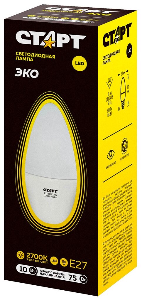 Лампа светодиодная LED Старт ECO Свеча, E27, 10 Вт, 2700 K, теплый свет информация: