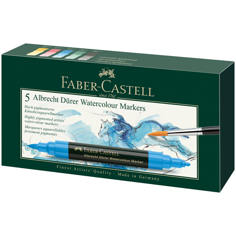Набор акварельных пигментированных маркеров Faber-Castell "Albrecht Dürer" 5 цветов, двухсторонние, кистевидный/пулевидный