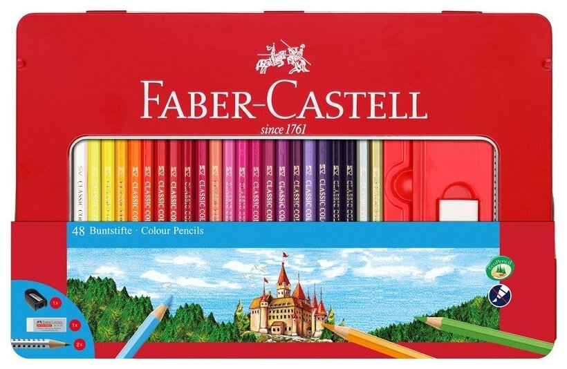 115888 Карандаши цветные Faber-Castell "Замок", 48цв., трехгран., заточ.+2ч/г кар. Grip+ластик+точилка, метал. коробка