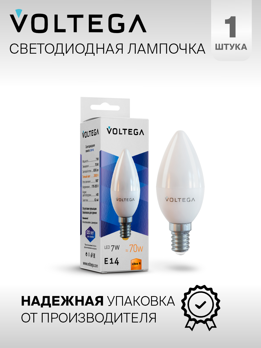 Лампочка светодиодная E14 форма свеча матовая 7W теплый свет Voltega Simple Candle 2800K 1 штука 145 ₽