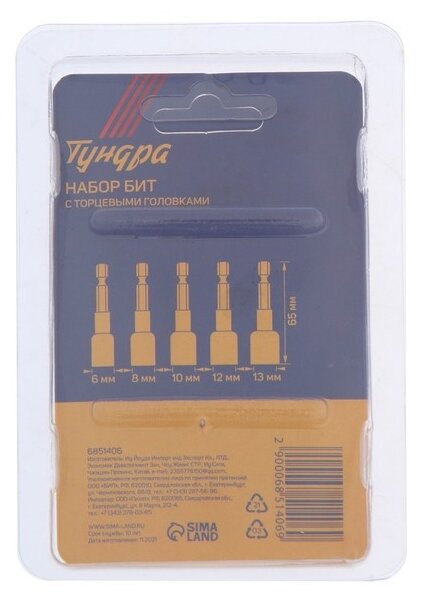 Набор бит с торцевыми головками тундра, CrV, магнит, 6-8-10-12-13 х 65 мм, 5 шт. 6851406 информация: