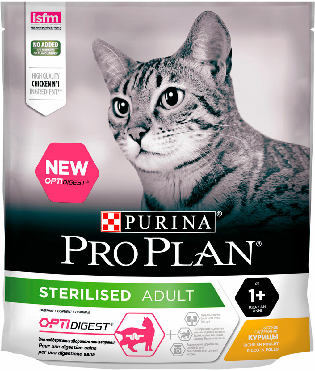 PRO PLAN CAT OPTIDIGEST STERILISED CHICKEN для взрослых кастрированных котов и стерилизованных кошек с чувствительным пищеварением с курицей (0,4 кг) информация: