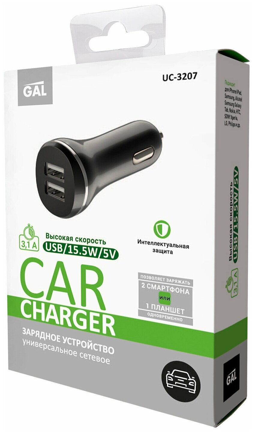 Зарядное устройство автомобильное GAL UC-3207 2 USB 3А информация: