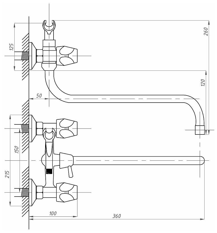 Смеситель на раковину настенный Эверест B46-350 с круглым поворотным изливом, кран-буксы 1/2", хром
