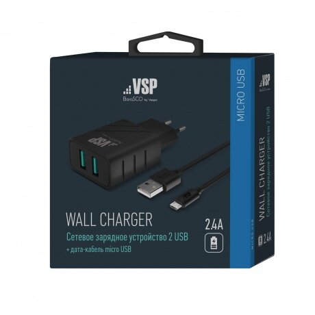 Сетевое зарядное устройство BoraSCO 2USB, 2,4A + Дата-кабель Micro USB, 2А, 1м, черное информация: