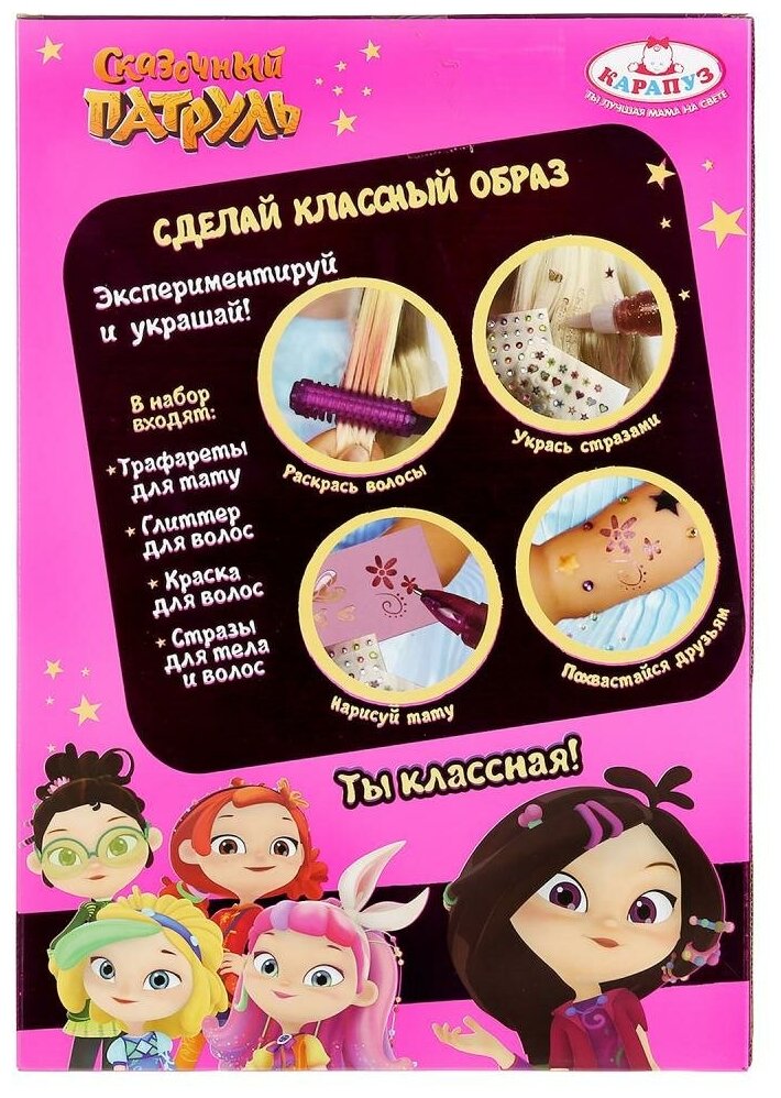 | Комплектация | кукла в одежде, расческа, трафареты для тату, глиттер для волос, краска для волос, стразы для тела и волос |