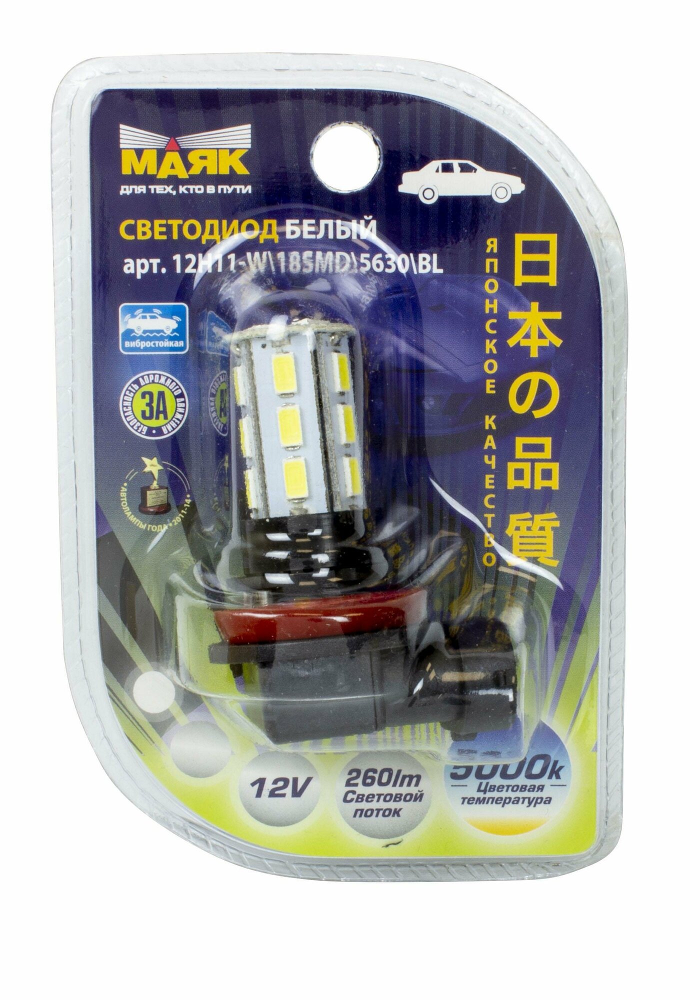 Лампа светодиод. H11-12V 18 диодов SMD белая 5500К блистер (PGJ19-2) (маяк) (100) 12H11W18SMD5630BL MAYAK