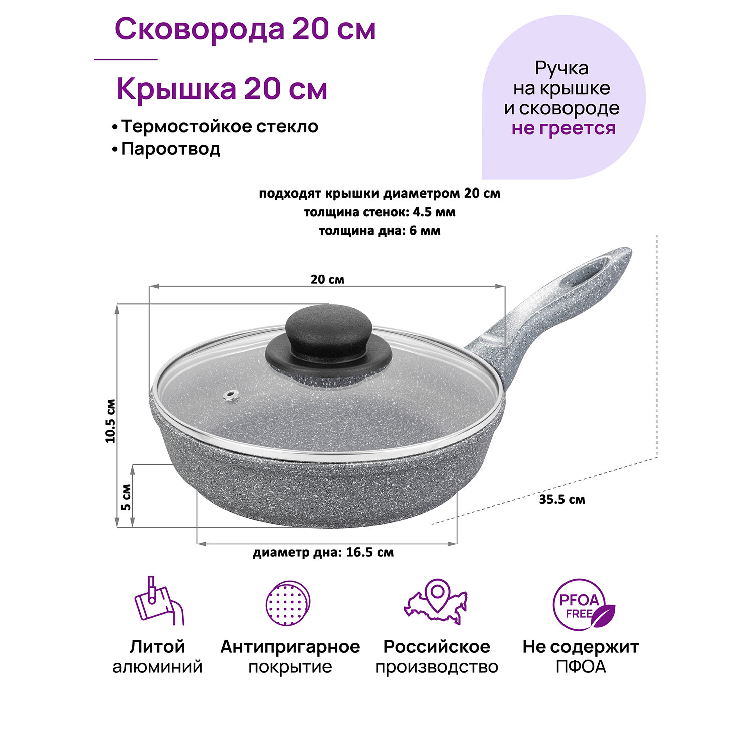 Отзывы на Сковорода глубокая 20 см Elan Gallery гармония вкуса Серый мрамор с крышкой D20, с несъёмной ручкой