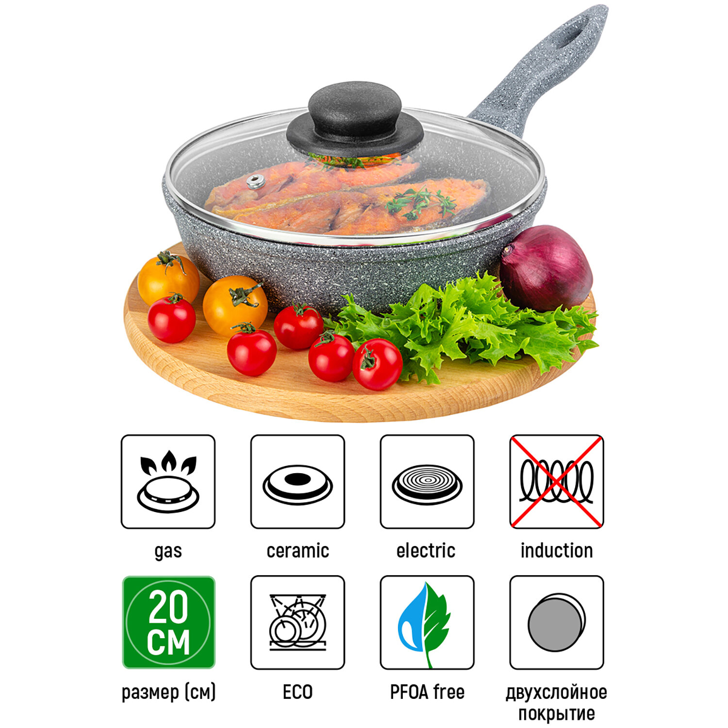 Сковорода глубокая 20 см Elan Gallery гармония вкуса Серый мрамор с крышкой D20, с несъёмной ручкой информация: