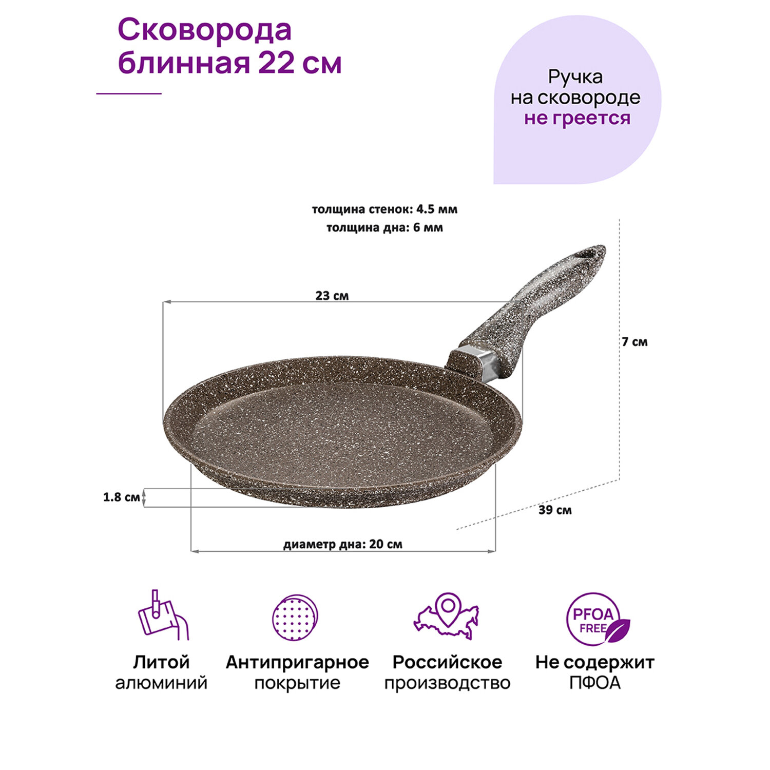 Сковорода блинная 22 см Elan Gallery гармония вкуса Коричневый опал, несъёмная ручка информация: