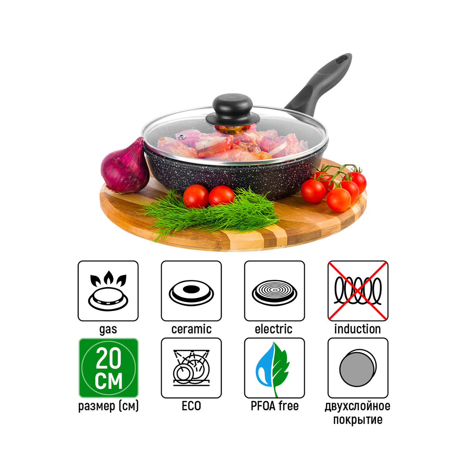 Сковорода глубокая 20 см гармония вкуса "Черный мрамор" С крышкой D20, с несъёмной ручкой информация: