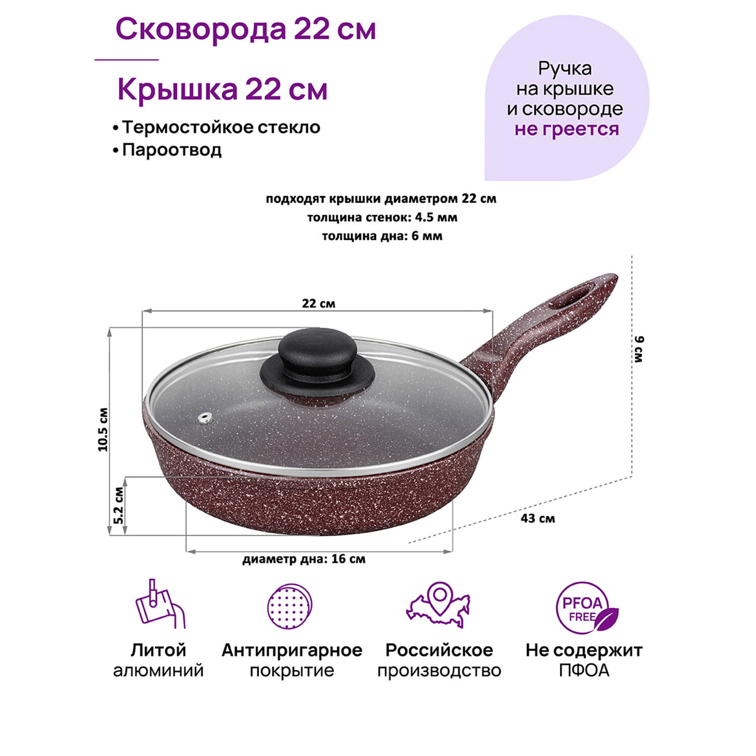 Сковорода глубокая 22 см Elan Gallery гармония вкуса Рубин с крышкой D22, с несъёмной ручкой информация: