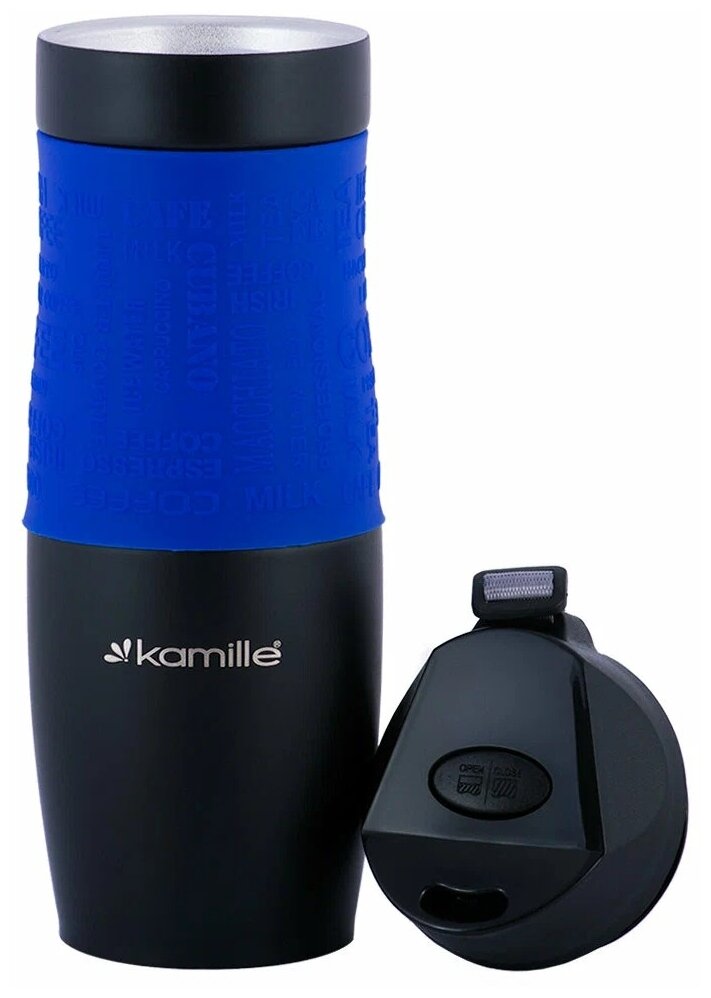 Термокружка 480 мл. из нержавеющей стали Kamille KM-2067 с TPR-вставкой и ремешком (2067 / синий)