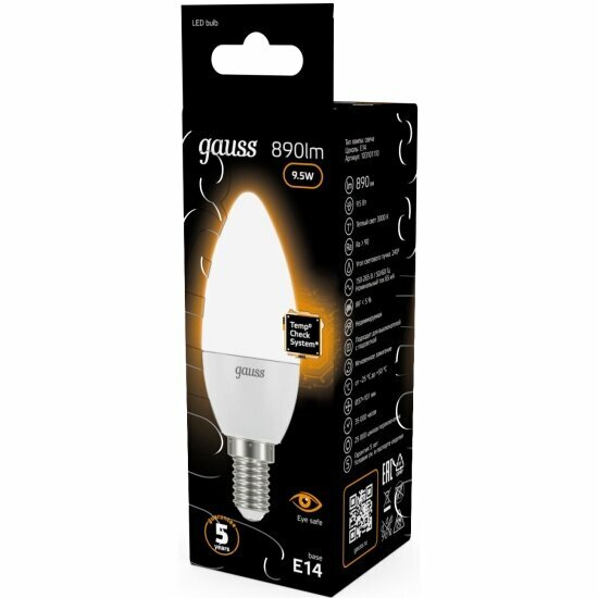 Светодиодная лампа Gauss LED Свеча E14 9.5W 890lm 3000К (упаковка 10шт) информация: