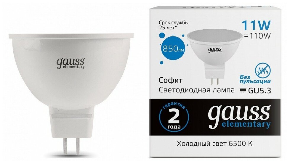 Отзывы на GAUSS(группа VARTON) Лампа светодиодная Elementary 11Вт MR16 6500К холод. бел. GU5.3 850лм GAUSS 13531