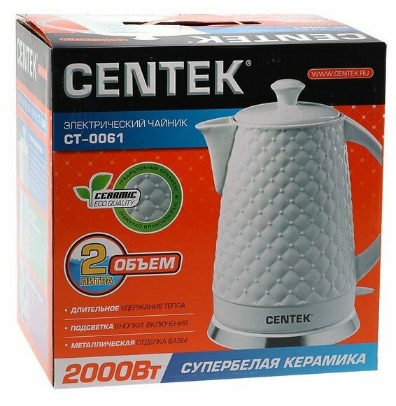 Чайник Centek CT-0061 2.0л, 2000W, супербелая керамика, рельефный корпус