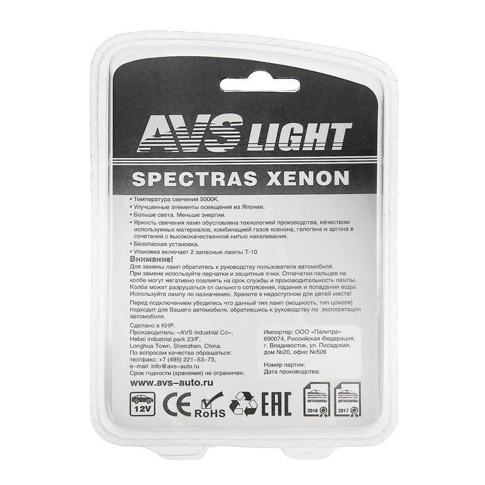 AVS Лампа автомобильная AVS SPECTRAS Xenon 5000K, H1, 12 В, 75 Вт, + T10, набор 2 шт информация: