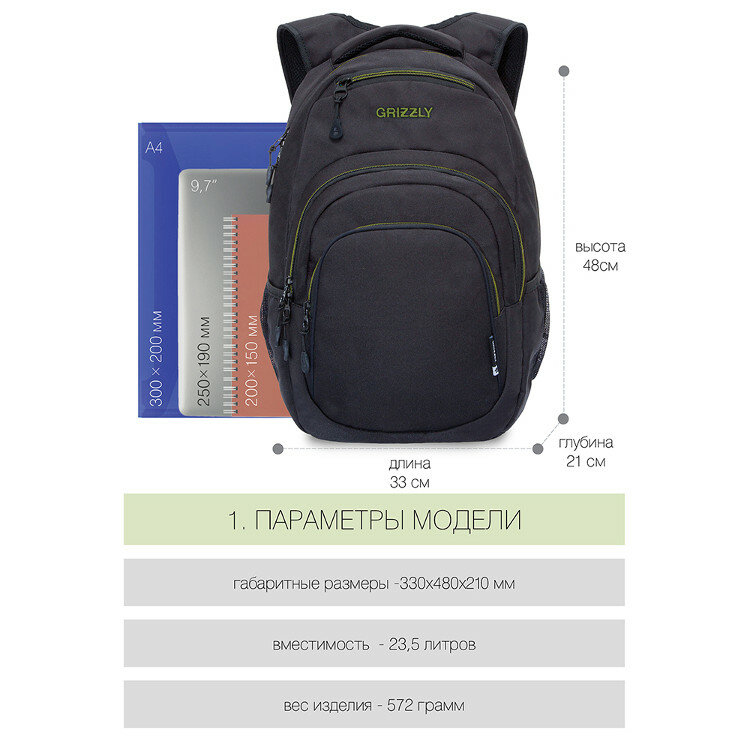 Рюкзак мужской Grizzly RQ-003-31 Черный - салатовый информация:
