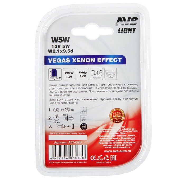 Лампа автомобильная AVS Vegas xenon effect, W5W, 12 В, 5 Вт, набор 2 шт информация: