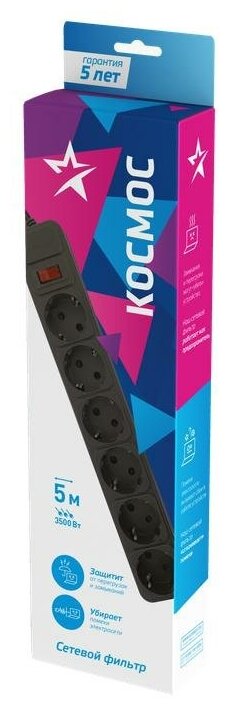 Сетевой фильтр Космос Электро Космос 6х5м с заземл. 16А IP20 3.5кВт с пред. 3х1 индик. сети, черный, FKsm5m-6g(B)16A
