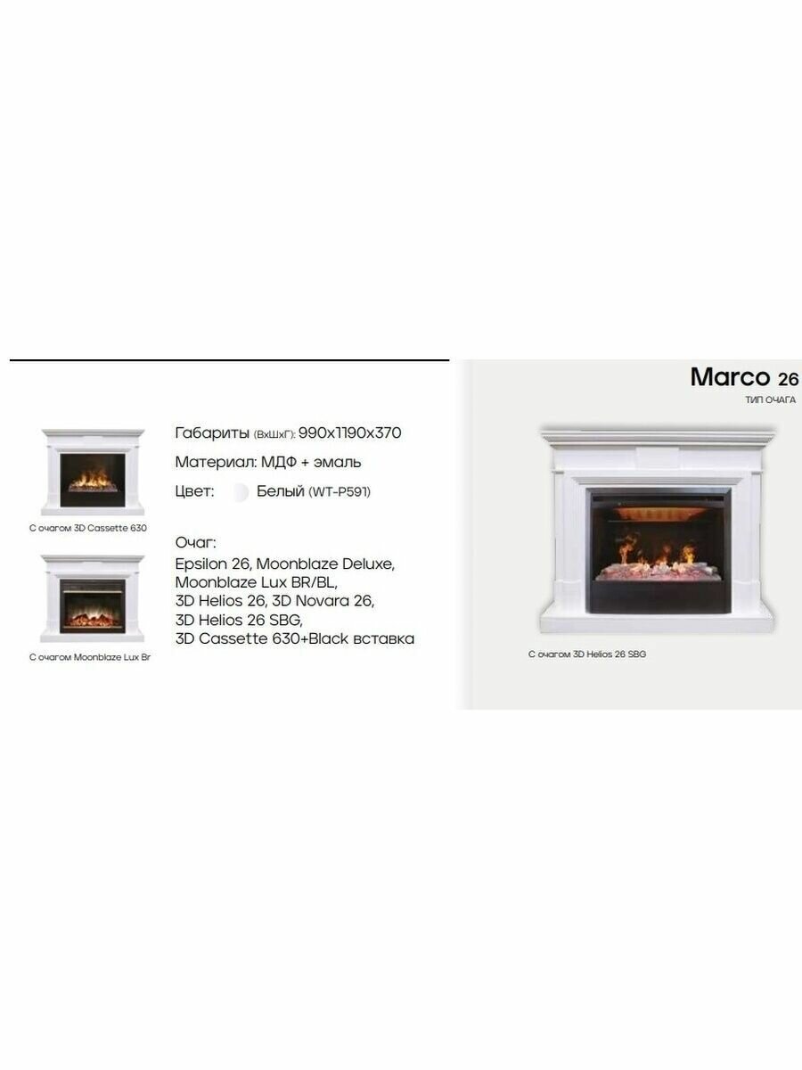 Электрокамин RealFlame Marco 26 WT-P591 с очагом 3D Cassette 630 + Black вставка информация: